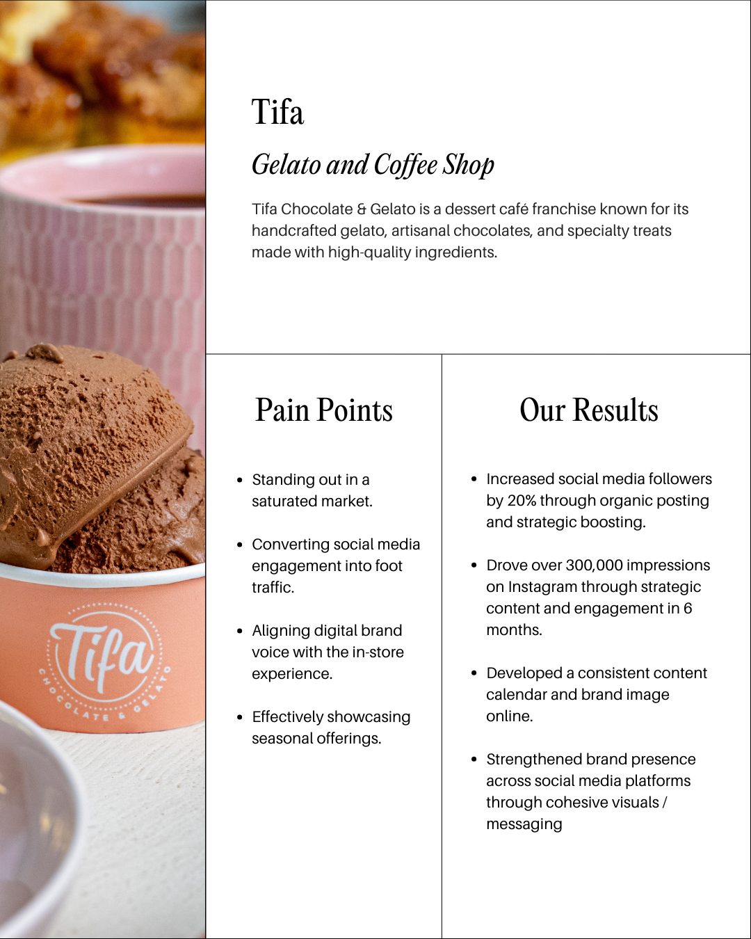 Social-first content for Tifa, a chocolate and gelato shop with locations in California and Texas.